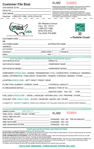The section below the dashed line needs to be filled in COMPLETELY with the customers company information: Serial No. = Not necessary Unit ID = i.e. Toms Truck System Oil Capacity = i.e. 8 quarts Filter Type = i.e. most of the time would be Element This very bottom section is the MOST IMPORTANT one of all. ALL FIELDS NEED TO BE FILLED IN COMPLETELY! Sample Date = i.e. 1/25/2005 |